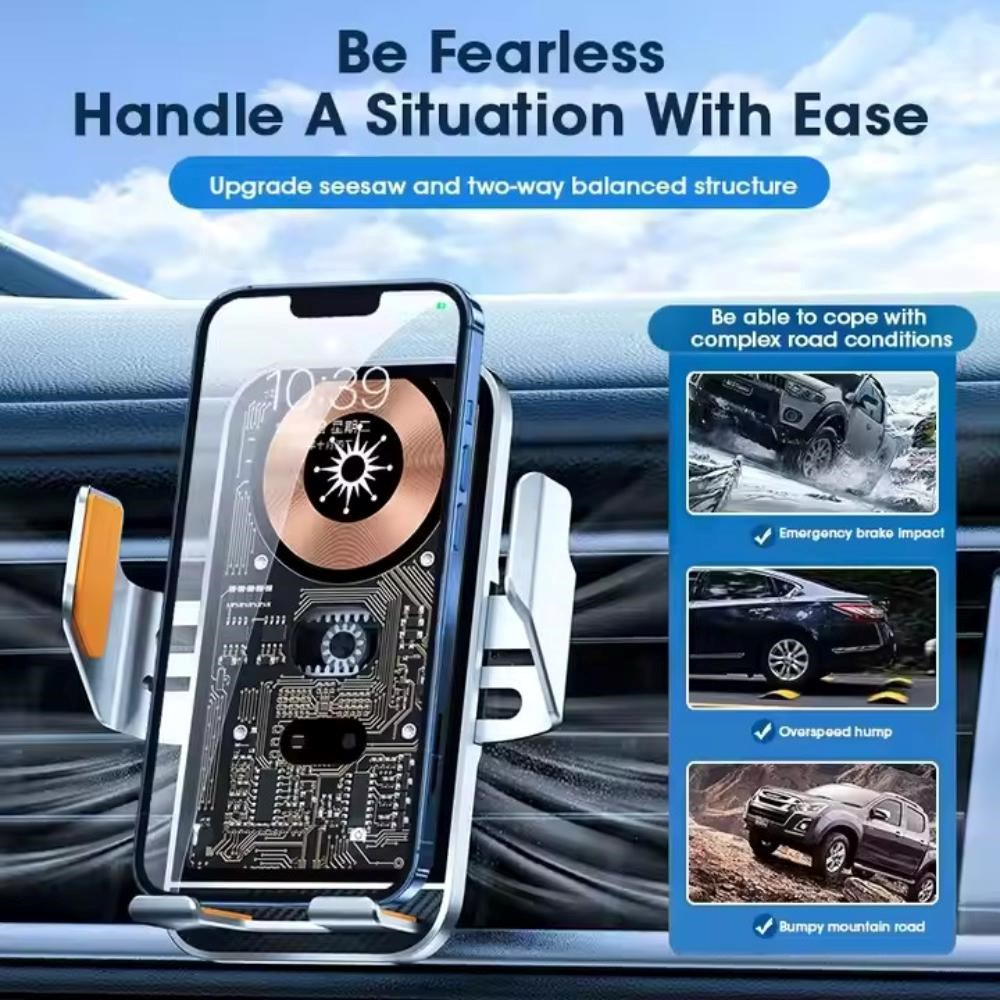 C10 Kvalitní hliníková bezdrátová inteligentní nabíječka do auta s optickým senzorem pro automatické rozevření při vkládání telefonu a dotykovým senzorem pro otevření držáku při vyjmutí. Vybavená je držákem s kloubovou aretací pro uchycení do ventilace.
