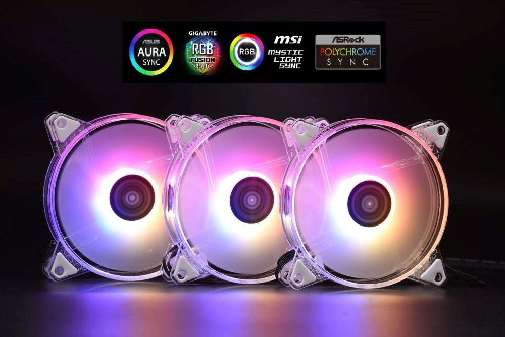 Také si můžete si vybrat z několika variant připravených setů a nebo poskládat řešení dle vlastních preferencí, všechny komponenty jsou vzájemně kompatibilní. A s řadičem a dálkovým ovládáním máte možnost samy regulovat výběr i rychlosti efektů, regulace intenzity podsvícení, otáček ventilátorů a nebo propojit celý systém přímo s základní deskou Vašeho počítače a to prostřednictvím třípinového ARGB konektoru. Řešení je kompatibilní se systémy ASUS Aura Sync, MSI Mystic Light, GIGABYTE RGB Fusion i ASRock Polychrome Sync.