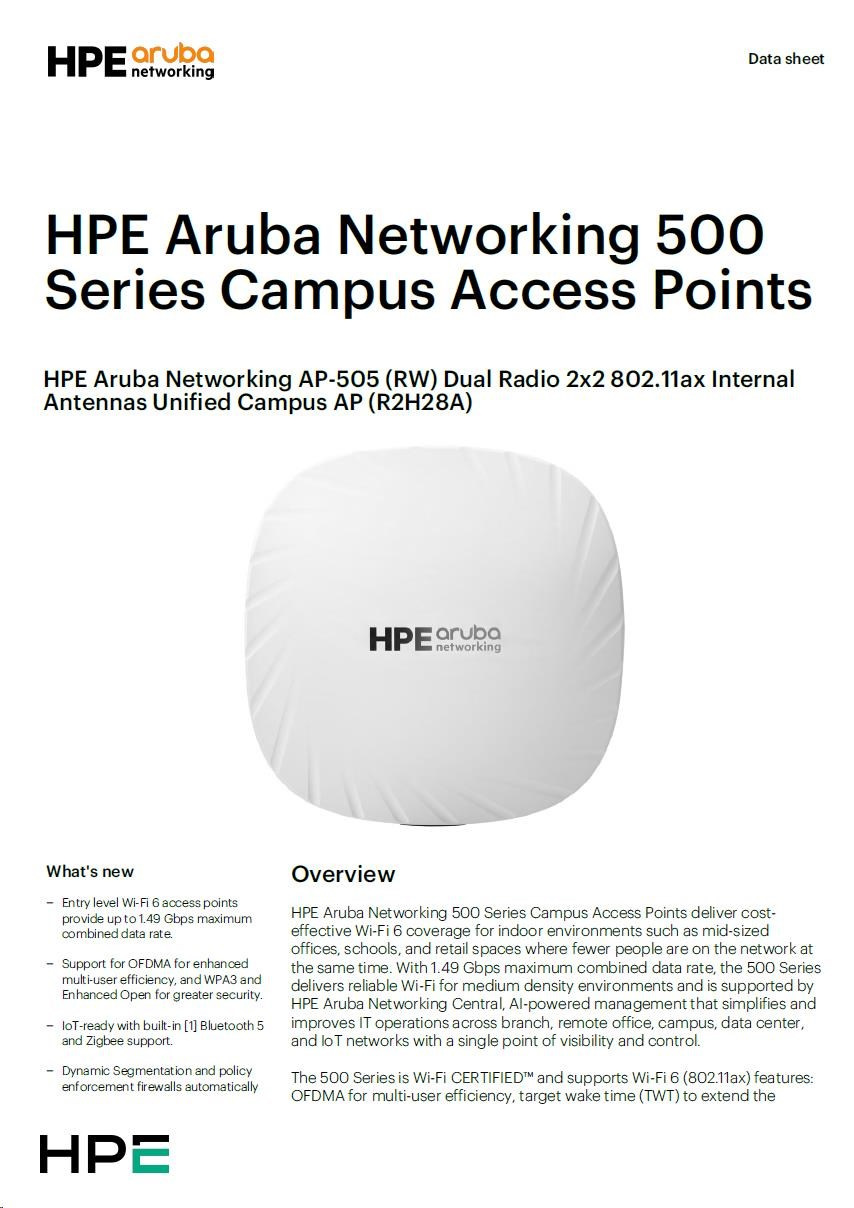 Diskuze k produktu 5 x HPE Aruba Networking AP-505 (RW) Dual Radio 2x2 802.11ax Internal Antennas Unified Campus AP ( 5 x R2H28A )