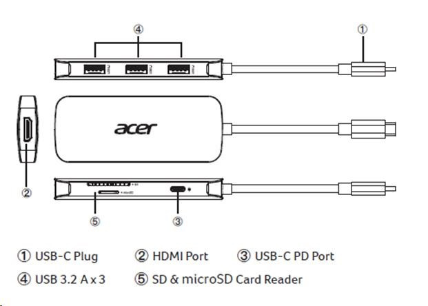 .Diskuze k produktu ACER Dokovací stanice 7in1 Type-C dongle, 1x HDMI, 3x USB-A 3.2 Gen1, 1x SD 3.0, 1x microSD, 1x USB-C, silver