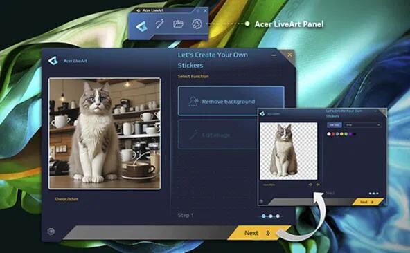 Nástroj AcerSense umožní přístup ke všem funkcím umělé inteligence na jednom místě. Acer PurifiedVoice 2.0 využívá umělou inteligenci k potlačení nežádoucího hluku na pozadí a zajišťuje výjimečně čistou a ostrou komunikaci. S funkcí Recall snadno získáte informace z minulých webových aktivit. Creator vytváří umělecká díla interpretací vašich obrazových nebo textových podkladů. Aplikace Acer LiveArt 2.0. dokáže okamžitě odstranit pozadí obrázků, vytvořit a vkládat AI nálepky, generovat obrázky a přidat vašim projektům osobní nádech.