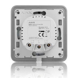 Napájecí napětí: 230V AC / 50 Hz Maximální spínaný výkon: 600 W pro spínače řazení 1, 6 a 7 300 W pro spínače řazení 5 Proudová ochrana: Nad 2\.6 A (Pokud je ochrana aktivována, LightSwitch vypne odpojí napájení a odešle notifikaci do aplikací Ajax). Teplotní ochrana: Nad 60 °C (Pokud je ochrana aktivována, LightSwitch vypne odpojí napájení a odešle notifikaci do aplikací Ajax). Připojení: Fázový vodič (nulový vodič není vyžadován)