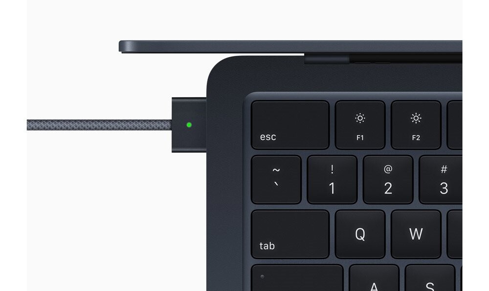 Napájecí konektor MagSafe 3 snadno připojíte i po slepu. Drží totiž pomocí magnetů, které však sevření rychle uvolní, když o kabel omylem zakopnete. Díky tomu MacBook Air M2 neshodíte na zem.