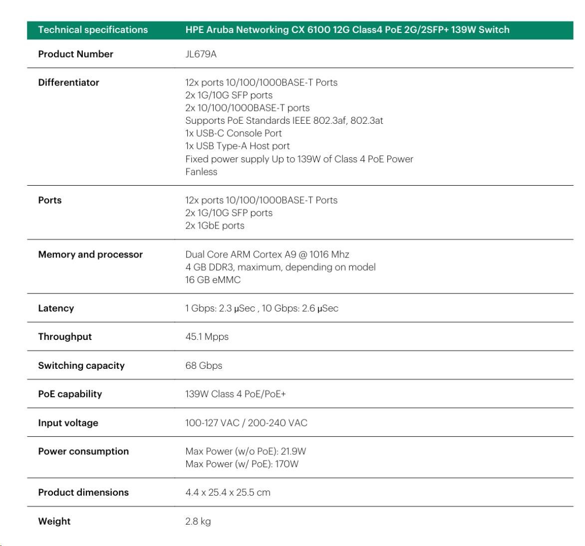 Aruba 6100 12G Class4 PoE 2G/2SFP+ 139W Switch JL679A RENEWProvedení:Rack mounted 19"; Funkce:QoS (Quality of service), VLAN (virtual local area network), PoE (Power over ethernet), DHCP snooping, Stohovatelnost, L2, L3, VPN; Technologie:Gigabit Ethernet 1000Mbps, 10 Gigabit optika, Gigabit ethernet + 10 Gigabit optika, Gigabit optika; Počet portů LAN:12; Podporované standardy PoE:802.3af, 802.3at.
