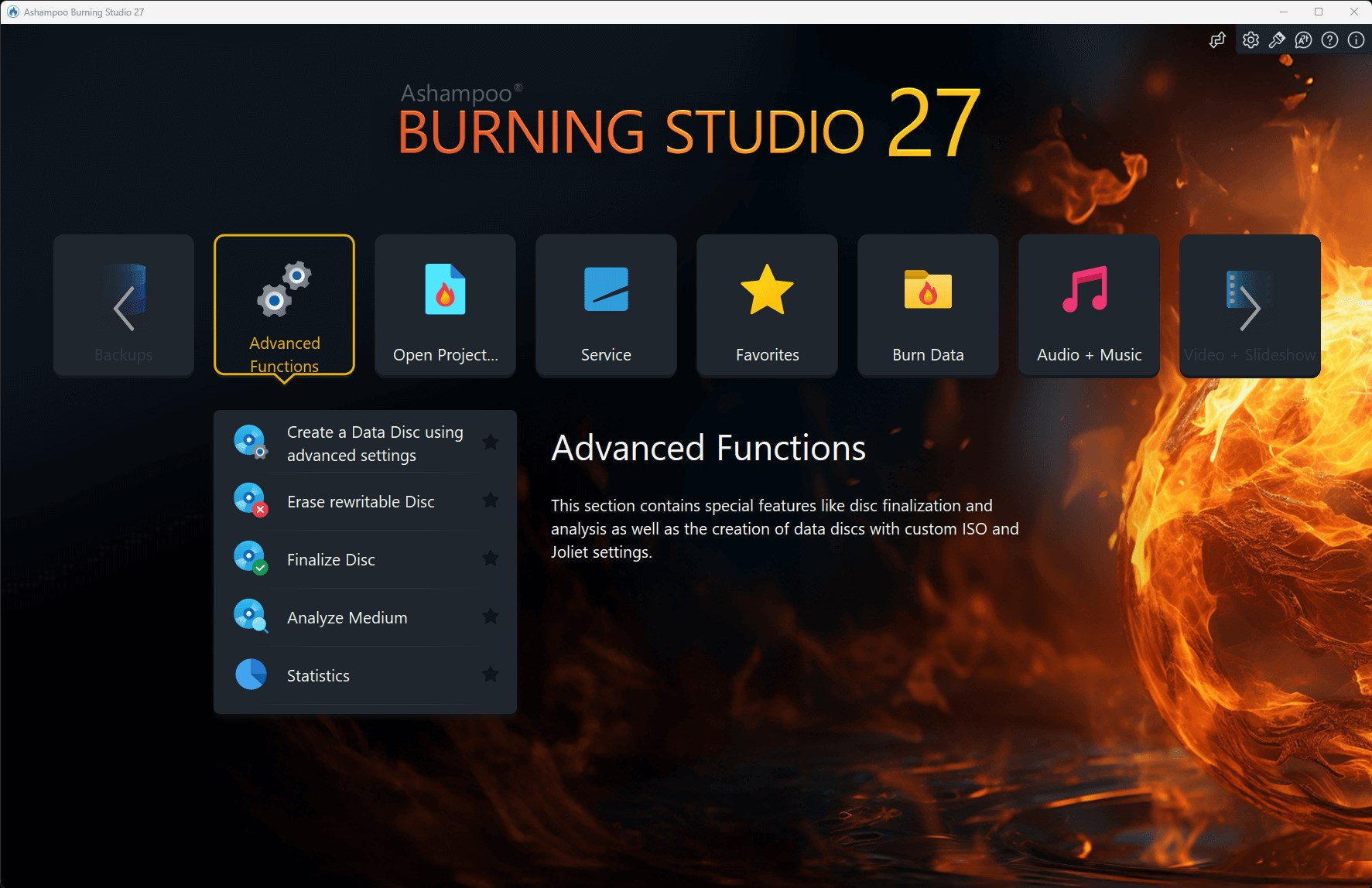 Nové Ashampoo Burning Studio 27 představuje nejpohodlnější způsob, jak bezpečně vypálit data a bez námahy kopírovat disky CD, DVD a Blu-ray. Ripujte zvukové disky a zálohujte hudbu nebo si vytvářejte vlastní hudební kompilace s vhodným obalem! Další špičkové multimediální funkce vám také umožňují vytvářet vlastní filmy a prezentace a dokonce je vypalovat na disk spolu s elegantními animovanými nabídkami. Rozlučte se se ztrátou dat, okamžitě zálohujte soubory a zapisujte důležitá data na jakýkoli typ disku s výkonnou kompresí a ochranou heslem. A nové funkce pro pohodlné používání audioknih, audiopřehrávání a podcastů zaručují vysoce kvalitní zábavu!