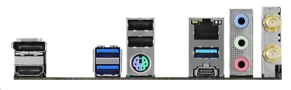 | Rear panel I/O | - 2 x Antenna Ports - 1 x PS/2 Mouse/Keyboard Port - 1 x HDMI Port - 1 x DisplayPort 1.4 - 2 x USB 2.0 Ports (Supports ESD Protection) - 3 x USB 3.2 Gen1 Type-A Ports (Supports ESD Protection) - 1 x USB 3.2 Gen1 Type-C Port (Supports ESD Protection) - 1 x RJ-45 LAN Port with LED (ACT/LINK LED and SPEED LED) - HD Audio Jacks: Line in / Front Speaker / Microphone |