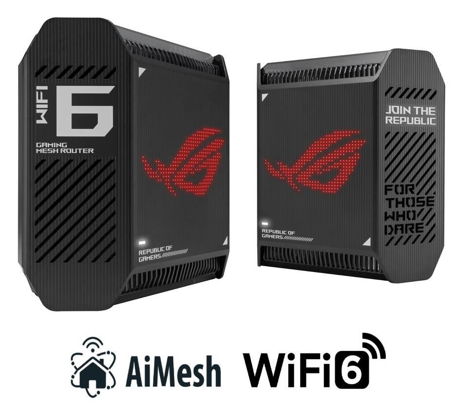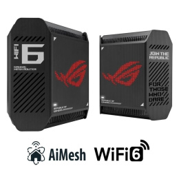 ROG Rapture Wifi 6 802.11ax Tri-band Gigabit Gaming Mesh System Wifi 6 802.11ax 574Mbps (2.4G) Wifi 6 802.11ax 4804Mbps (5GHz-1) Wifi 6 802.11ax 4804Mbps (5GHz-2) Data rate: 10000Mbps Whole home mesh wifi system for large and multi-story homes Supports flexible SSID setting, wired inter-router connections OFDMA + MU-MIMO tech, 1024 QAM, 2.5G WAN port, Triple level Game Acceleration, Aura RGB lighting, AiProtection Pro, VPN Fusion, Instand Guard Adaptive QoS, Bandwidth control, AiMesh, ASUS Roter APP (ROG theme).