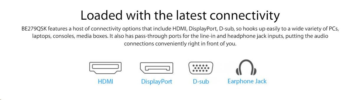 Extensive connectivity with DisplayPort, HDMI, D-sub, Audio in and Earphone jack for the most flexibility.