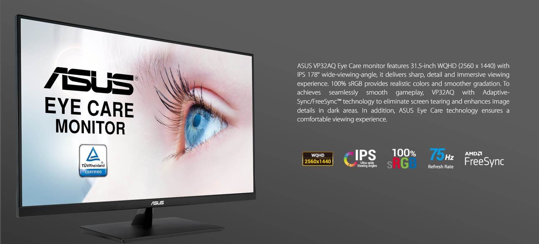 ASUS LCD 31.5" VP32AQ 2560x1440 IPS 350cd 5ms DP HDMI REPRO - HDMI kabelRozlišení displeje:2560x1440; Úhlopříčka displeje ("):31.5; Výbava:Reproduktory, VESA montáž, FreeSync, Redukce blikání (flicker-free), Redukce modrého světla; Doba odezvy (ms):5; Barevná hloubka (bit):10; Formát obrazovky:16:9; Typ panelu:IPS; Jas (cd/m2):350; Kontrast:1:1000; Obnovovací frekvence displeje (Hz):75; Povrchová úprava displeje:Matný.