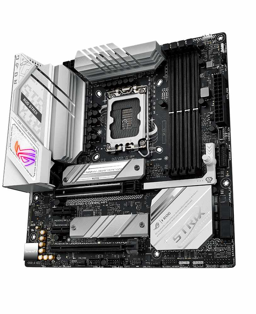 Midsize overperformer: the ROG Strix B760-G Gaming Wi-Fi is a monochrome powerhouse, ready to propel your next mATX rig. It bears the same high-bandwidth connectivity as its trusty counterpart, but diverges with lightning-fast DDR5 memory and buffed power stages to complement high-speed Intel 14th Gen processors. White and silver accents pair perfectly with the ASUS AP201, and retro insignias give it a dash of classic Strix style.