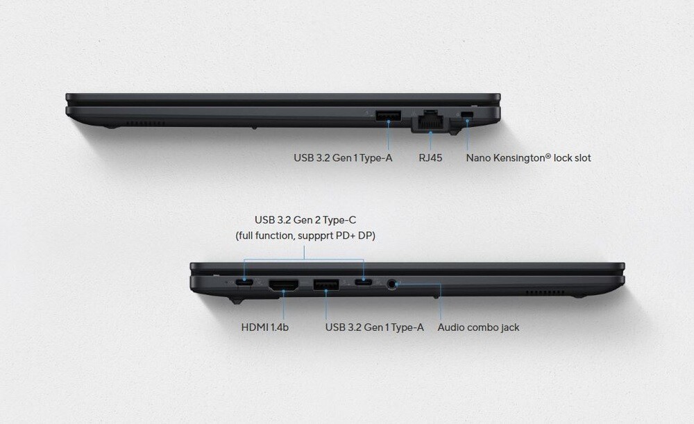Asus ExpertBook BM1 je vybaven dvojicí moderních oboustranných konektorů typu USB-C s designem, který umožňuje připojení libovolného zařízení. Oproti staršímu typu připojení USB 2.0 rovněž poskytuje až 10× vyšší rychlost přenosu dat a navíc jej lze použít k připojení dalšího displeje přes rozhraní Thunderbolt 4. Na těle zařízení se dále nacházejí dva porty USB 3.2 a výstup HDMI 1.4, takže můžete bez sebemenších potíží snadno připojit všechny své stávající periferie, displeje a projektory. Možnosti bezdrátového připojení pak zastupují Bluetooth 5.4 a Wi-Fi 6E.