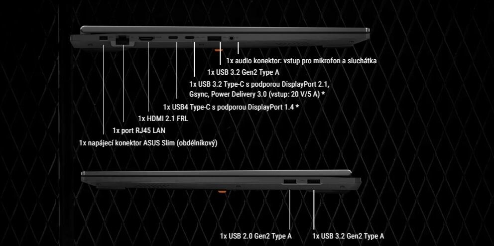 Nejmodernější zařízení k notebooku snadno připojíte s všestranným portem USB-C, který disponuje podporou rozhraní DisplayPort, umožňujícího připojení 4K displeje nebo televizoru či monitoru s rozlišením až 8K UHD pro pohlcující obraz. Pro periferie je pak připravena dvojice portů USB 3.2 a jeden USB 2.0. Pomocí bezdrátového rozhraní Bluetooth 5.3 můžete spárovat myši, sluchátka a další kompatibilní zařízení a získat tak pracovní prostor bez rušivých elementů. A co by to bylo za herní notebook bez parádně rychlého připojení k internetu? Využijte služeb klasického rozhraní RJ-45 nebo Wi-Fi 6E a získejte rychlé a spolehlivé připojení bez lagů a s nízkými latencemi všude tam, kde je k dispozici bezdrátová síť.