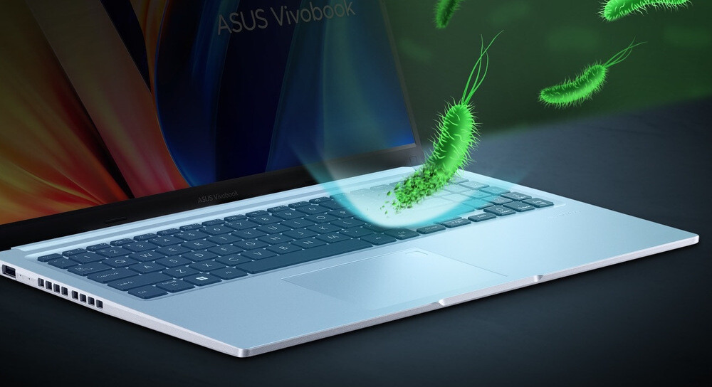 Ochrana ASUS Antimicrobial Guard byla aplikována na často dotýkaná místa notebooku a aktivně potlačuje výskyt virů a nebezpečných bakterií, mezi které patří například SARS-CoV-2 (COVID-19), H3N2 (chřipka A) či bakterie E.coli.