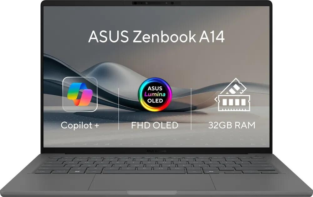 ASUS Zenbook A14 v elegantním minimalistickém designu je Copilot+ PC notebook s procesorem Qualcomm Snapdragon X a integrovanou umělou inteligencí. S hmotností menší než jeden kilogram a několikadenní výdrží baterie vám výborně poslouží na cestách.