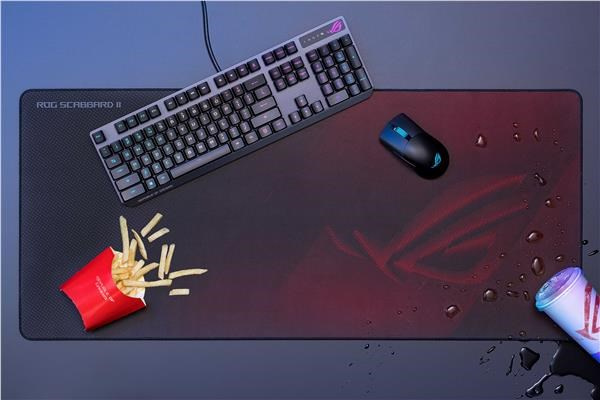 ROG Scabbard II extended gaming mouse pad with protective nano coating for a water-, oil-and dust-repellant surface, with anti-fray, flat-stitched edges and a non-slip rubber base
