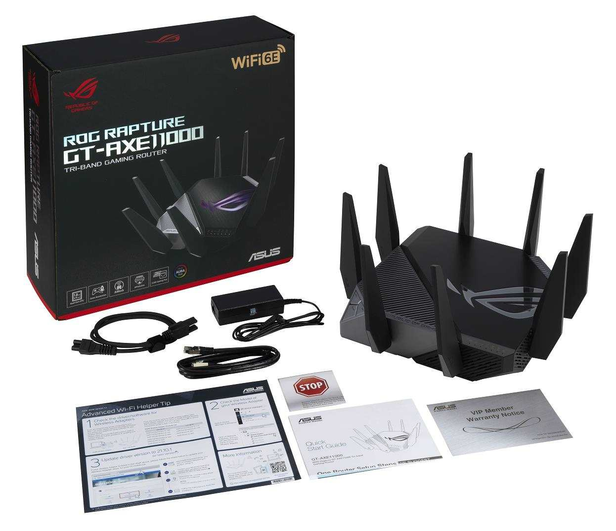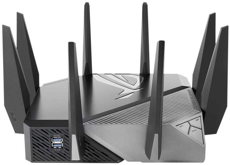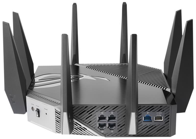 ASUS ROG Rapture GT-AXE11000 (AXE11000) WiFi 6E Extendable Gaming Router, 2.5G port, Aimesh, 4G/5G Mobile TetheringTyp aktivního prvku:Wifi Router; Frekvenční pásmo (GHz):2,4, 5; Podporované standardy:802.11ax, 802.11b/g, 802.11b/g/n, 802.11a, 802.11b, 802.11a/n, 802.11g, 802.11n, 802.11ac; Zabezpečení:WPS, WPA, WPA2, WPA-Enterprise, WPA2-Enterprise, WPA3; Typ antény:Vestavěná; USB port; Použití:Vnitřní; Počet portů LAN:4; Počet portů LAN:4; Počet WAN portů:1.