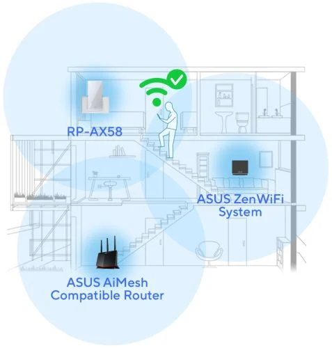 RP-AX58 byl primárně navržen pro použití v sítích využívajících AiMesh, jenž umožňují sdílení nastavení primárního routeru pro všechny připojené routery/opakovače signálu. Pokud ovšem tuto funkci nevyžadujete, nic se neděje, RP-AX58 se bezproblémově propojí s naprostou většinou routerů a umožní jim prodloužit signál.