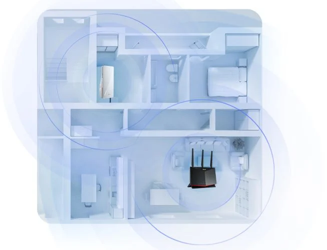 Technologie AiMesh umožňuje propojení několika kompatibilních ASUS Wi-Fi routerů a prodlužovačů signálu, pro vytvoření mesh Wi-Fi sítě. Tento druh sítě se tváří jako jediná bezdrátová síť, která vaše zařízení inteligentně připojuje k routeru/opakovači, který má v daném místě nejsilnější signál. Jakmile se přesunete blíže k jinému routeru/opakovači, mesh síť vás automaticky připojí na něj.