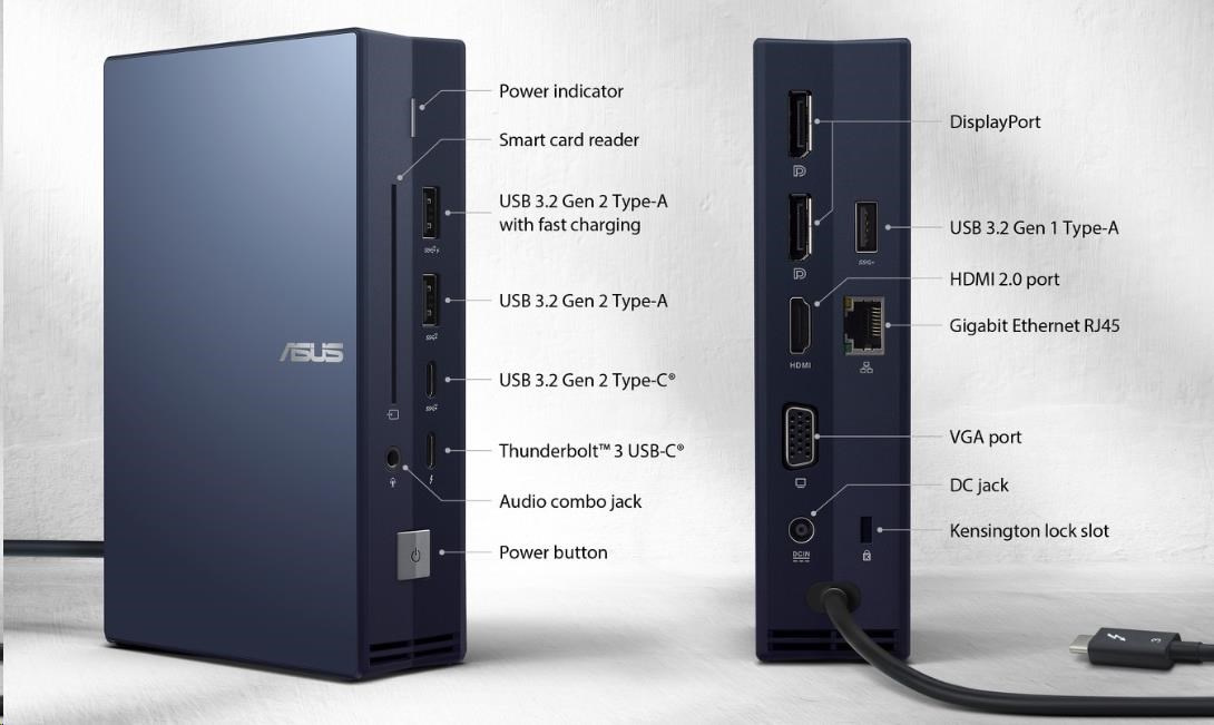 ASUS SimPro Dock 2 je užitečným doplňkem pro váš notebook. Zejména u kompaktních, skromněji vybavených počítačů zajistí pohodlí mnoha přídavných portů a konektorů. Ty pak zvětší využitelnost notebooku, pomohou vám zachovat pořádek na pracovním stole a od elektroniky se s nimi dokážete odpojit doslova okamžitě. K propojení stanice ASUS a notebooku dochází skrze rozhraní USB-C. Standardem konektorů je Thunderbolt 3. Náročným uživatelům se jistě bude hodit podpora více monitorů. Její rozměry činí 9,9 × 16,15 × 4,06 cm a hmotnost je 650 g.