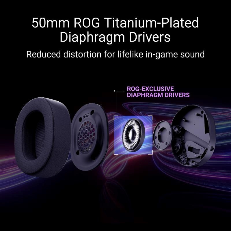 - 50mm měniče ROG s titanovou membránou: Exkluzivní měniče ROG zajišťují bohatý, detailní zvuk se širokou frekvenční odezvou 20 Hz–20 kHz