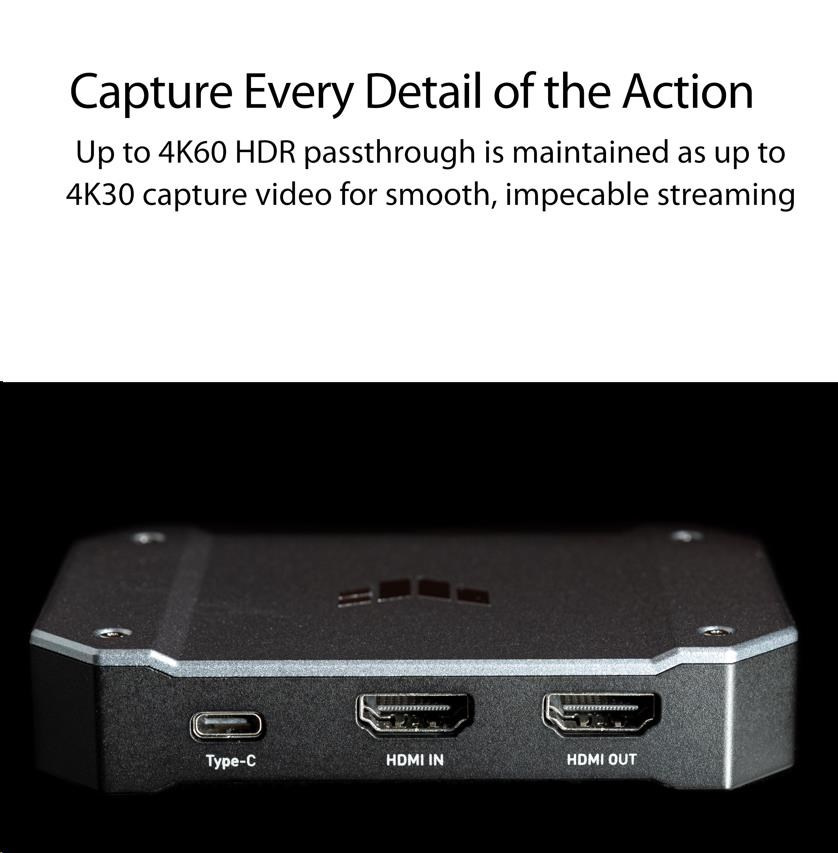 Kompaktní ASUS TUF GAMING CAPTURE BOX-4KRPO připravený ke streamování přináší neuvěřitelné 4K60 video s téměř nulovou latencí, aby zaujal fanoušky a následovníky.