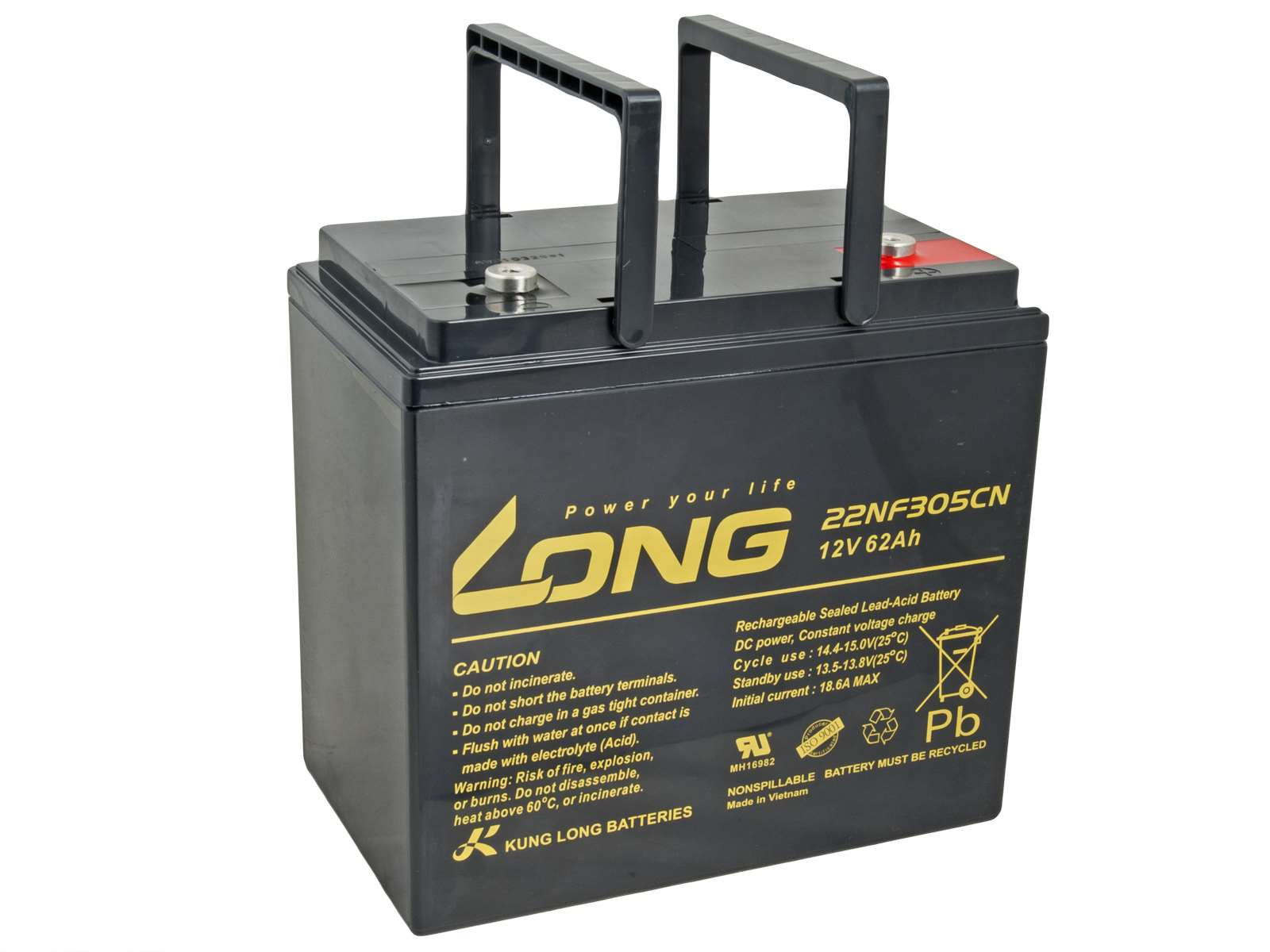 Rozměry: 226 x 135 x 207mm Parametry: Konektory: M6 Napětí: 12V Kapacita: 62Ah Rozměry (d x š x v): 226 x 135 x 207mm Rozměrové tolerance: 226(+2-1) x 135(+2-1) x 207(+2-1)mm Hmotnost: 18,7kg Elektrolyt: AGM Typ akumulátoru: DeepCycle VRLA - Ventilem řízený olověný akumulátor z anglického Valve Regulated Lead Acid je typ bezúdržbového akumulátoru, který lze provozovat v libovolné poloze, protože elektrolyt není v tekutém stavu. Hlavní vlastnosti akumulátoru jsou spolehlivost, dlouhá provozní životnost, otřesuvzdornost a vysoká kvalita zpracování. AGM - Akumulátor s elektrolytem nasáknutým do netkané textilie ze skelného vlákna (Absorbed Glass Mat) DeepCycle - Akumulátor určený pro cyklické vybíjení a nabíjení s možností hlubokého vybití, často nazývaný jako trakční baterie. Nejčastější aplikace a oblasti využití: - Elektrické invalidní vozíky a skútry - Rybářské čluny a lodě - Echoloty a sonary - Golfové vozíky - Fotovoltaické systémy - Karavany, obytné vozy a kempování - Dětská elektrická vozítka a hračky - Semafory, výstražné značení pro řízení dopravy - Manipulační technika a vysokozdvižné vozíky - Zahradní traktory a sekačky Nahrazuje: EVX12520, CTC55-12, FG12-55D, OTL55-12, HZY-EV12-55, WP55-12NE, 22NF305CN, LTC12-55, UC55-12.