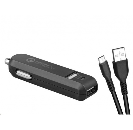 USB nabíječka do auta s rychlonabíjením Qualcomm Quick Charge 2.0 na obou USB výstupech. Včetně 100cm nabíjecího/datového kabelu USB - micro USB.