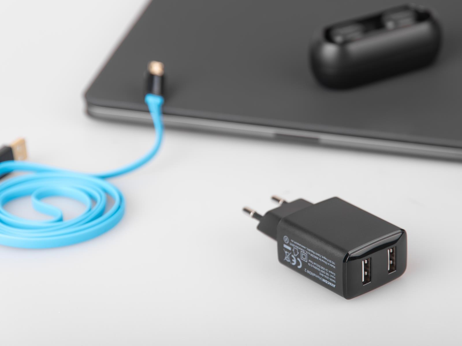 Univerzální síťová nabíječka, 2x USB výstup pro nabíjení smartphonů, tabletů a dalších zařízení.