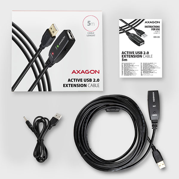 Aktivní prodlužovací USB 2.0 kabel AXAGON ADR-205 délky 5 metrů je ideální k propojení Vašeho počítače s USB zařízením jako je myš, klávesnice, webkamera, tiskárna, skener, plotr a dalšími. Aktivní USB repeater kabel zesiluje průchozí signál a umožnuje připojit USB zařízení na výrazně větší vzdálenost, než Vám umožní pasivní kabel. Dosah kabelu je možné dále prodloužit použitím několika kabelů za sebou.