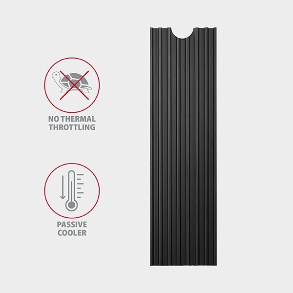 Žebrovaný hliníkový chladič vysoký 3 mm, napomáhá lepšímu odvodu tepla vzniklého při provozu M.2 SSD disku a umožňuje tak snížit teplotu disku až o 15 °C. Prodlužuje se tak životnost M.2 SSD disku a zamezí se zpomalování rychlosti disku tzv. „Thermal Throttling“.