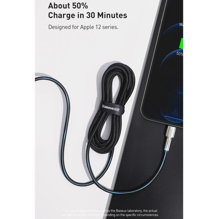 Kabel BASEUS Cafule Metal Series je odolný kabel, ve kterém jsou konce zástrček potaženy slitinou zinku, aby přežily dlouhé a intenzivní používání. Výrobek je také vybaven speciálním nylonovým opletením, které zabraňuje tření a chrání tak kabely uvnitř. Rovněž se zvýšila trvanlivost zástrček - prošly testem 10 000 připojení a byly speciálně profilovány tak, aby bylo možné kabel použít, i když je telefon v pouzdře. Kabel má funkci rychlého nabíjení PD 20W a přenosu dat. Jeho délka je 200 cm.