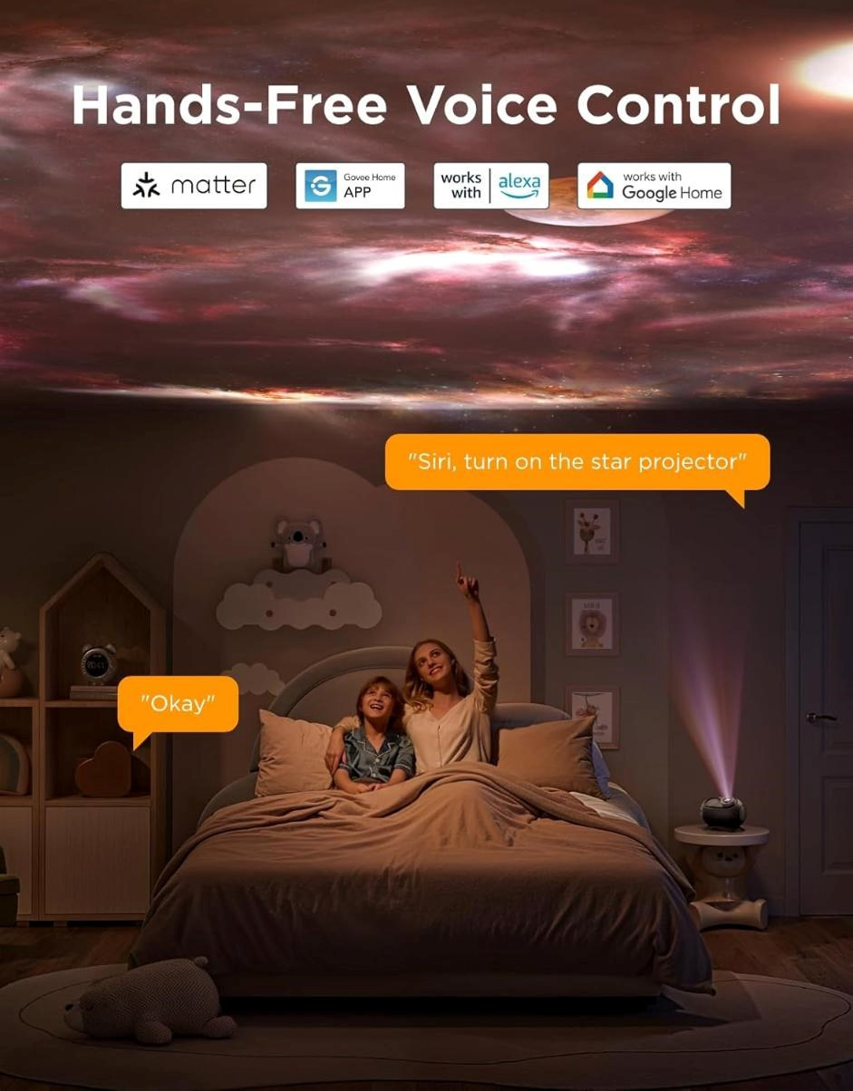 Díky pokročilým funkcím se Govee Galaxy Light Projector 2 Pro snadno stane součástí vašeho chytrého domova. Podpora Matter, Alexa i Google Assistant znamená plnou kompatibilitu a rychlé hlasové ovládání. Pomocí aplikace Govee Home můžete okamžitě přepínat mezi oblíbenými scénami, nastavit jas nebo změnit motiv. To vše bez složitého nastavování, s možností přizpůsobit si atmosféru na míru jedním dotykem.
