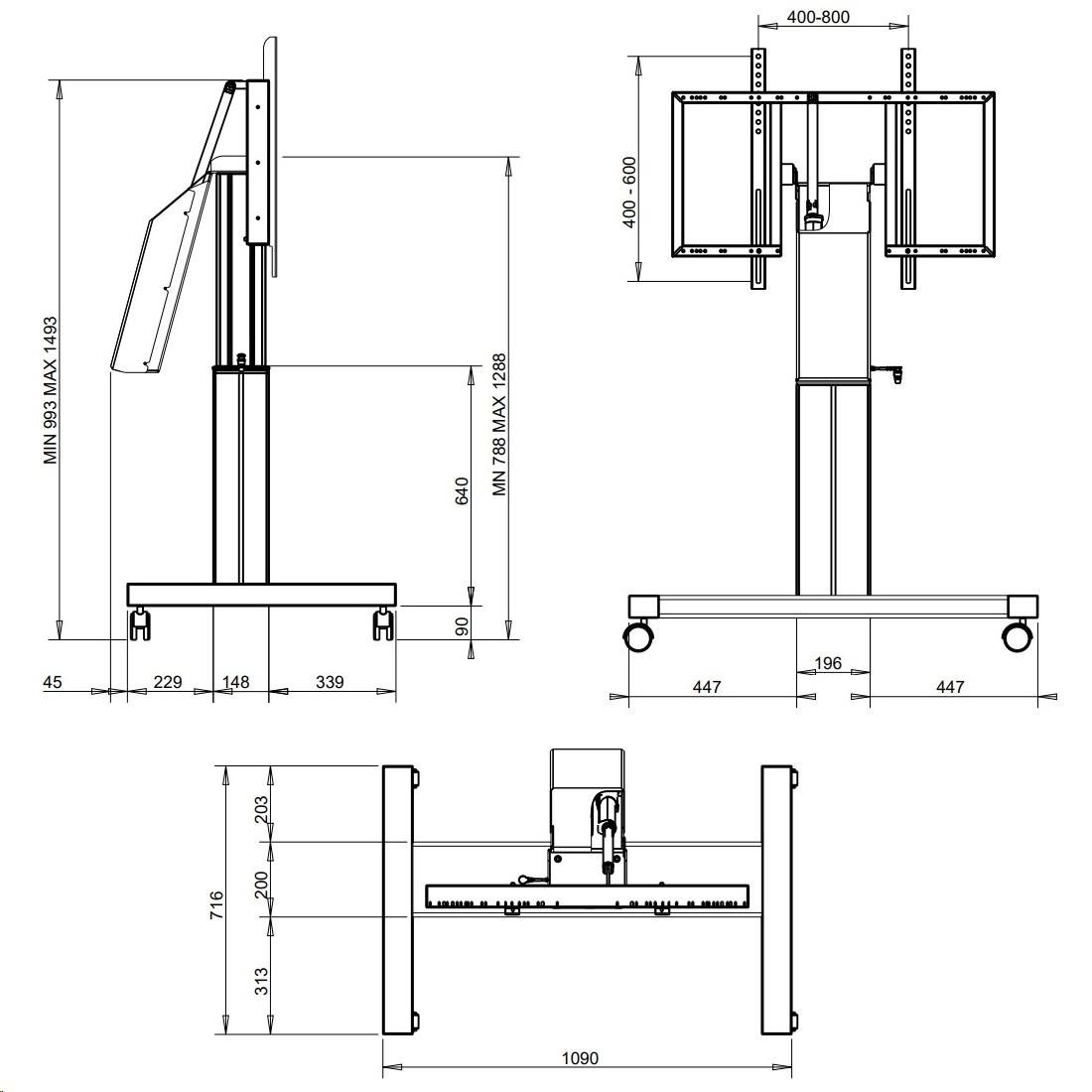 Stojan na televize i monitory, který má plně motorizované nastavení výšky i náklonu obrazovky, ovládání pomocí ovládacího panelu. Kdykoliv můžete změnit výšku obrazovky v rozmezí od 788mm až do 1288mm (výška od podlahy po střed obrazovky) a náklon obrazovky od 0° (obrazovka je svisle) až do 90° (obrazovka je vodorovně) jednoduše a rychle pouhým stiskem tlačítka na dálkovém ovládání. Konstrukce Tv stojanu je profesionální kvality, zavěsit je možné televizory a monitory s hmotností až 150kg.