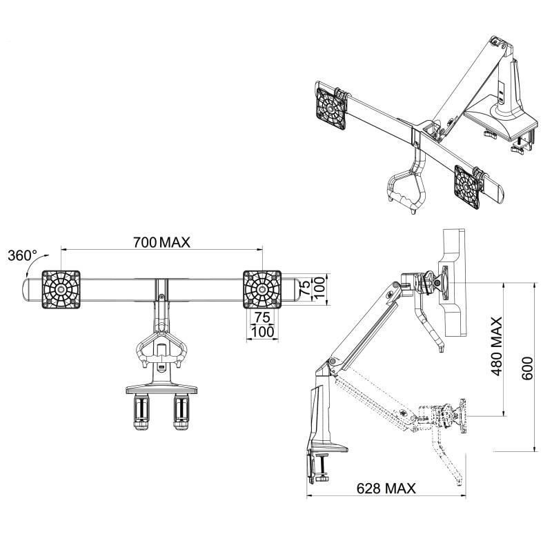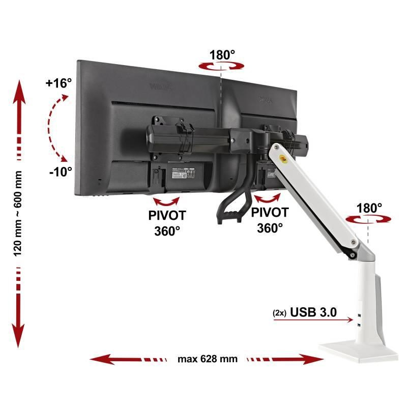 Bílý stolní držák na dva monitory NB F27WStolní držák na 2 monitory 19-27", otočný +/-180°, sklopný +16°/-10°, nastavení výšky 120-600mm, vzdálenost od úchytu dle natočení 0-628mm, 2x port USB 3.0, 2 typy stolních úchytů, systém vedení kabeláže, VESA 75x75 a 100x100, nosnost 12kg, bílé provedení.
