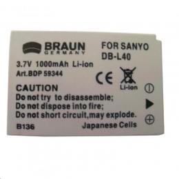 Li-Ion akumulátor Braun BDP-SDBL40 (D87, Sanyo DB-L40 - 3,7 V/1000 mAh) pro digitální fotoaparáty SANYO Xacti VPC HD1, HD2, HD700, HD800. Tento akumulátor je dodáván v částečně nabitém stavu. Před použitím je vhodné akumulátor nabít. Plné kapacity akumulátoru může být dosaženo až po cca 4-5 nabíjecích cyklech..