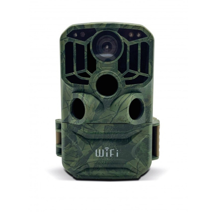 Fotopast s CMOS 8MP, objektivem 90° a WiFi komunikací s mobilem pomocí free App. Záznam 1-3 foto 24 MP nebo 5-180s video 2,7K, 3xPIR senzor 120°/ odezva 0,6s/ 34 Black IR LED do 20m, vnitřní 2" LCD, SD do 32GB, 8x AA baterie, rozměry 95x137x64mm, hmotnost 292g. Voděodolný přístroj dle IP66, barevné denní záběry a černobílé v noci, WiFi - free App pro kontrolu, stahování a živý náhled v dosahu přístroje, záznam datumu, času, teploty a fáze měsíce, PIR senzor má 3 citlivosti, interval mezi záběry 5s-60min, časosběrné záběry 5s-24h, stand-by až 6 měsíců, mikrofon, reproduktor. Slot SD, miniUSB, DC in 6V/2A pro externí zdroj, TV out, stativový závit, design camouflage. V dodávce kabely USB/TV out, dálkové ovládání, řemen a kovové uchycení s kulovou hlavou. BlackVision LED nejsou vidět ani při přímém pohledu na fotopast při expozici..