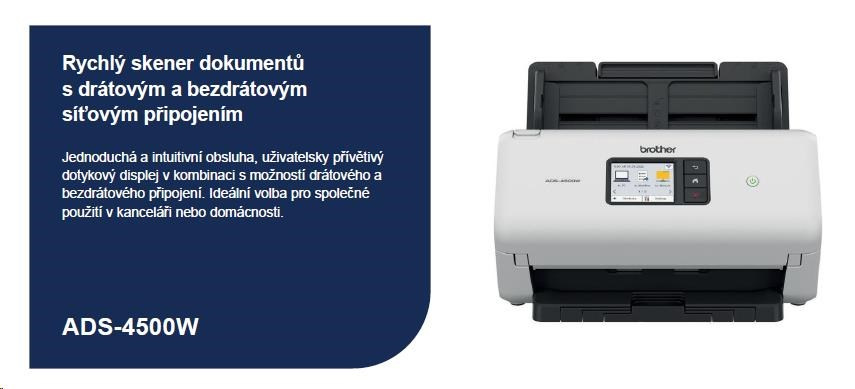BROTHER skener ADS-4500W DUALSKEN A4 35ppm/70dual 600x600 60ADF USB LAN WIFI - display 7.1cmAutomatický podavač dokumentů; Formát:A4; Rozhraní:USB, RJ-45 (Ethernet), Wi-Fi; Funkce:Automatické oboustranné skenování; Skutečné rozlišení skeneru (v DPI):600; Typ skeneru:Plochý.