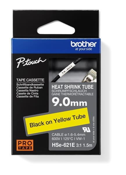 BROTHER smršťovací bužírka - HSE-621E žlutá pro E300VP H300 H500 E550 P700 P750 D800 P900 P950 - 9,0mm / 1,6-5,4 / 3:1Typ produktu spotřebního materiálu:Barevná cartridge/toner/páska.