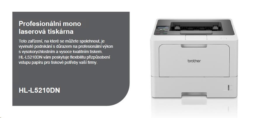 Profesionální síťová mono laserová tiskárna Brother HL-L5210DN je ideální pro podniková prostředí, kde je potřeba rychlého a efektivního tisku. S možností tisku až 48 stránek za minutu a oboustranného tisku až 24 stran za minutu, je tato tiskárna navržena pro vysoké nároky firemního tisku. Gigabitový Ethernet zajišťuje rychlou a stabilní síťovou konektivitu, což umožňuje bezproblémové sdílení tiskárny v rámci pracovní skupiny.