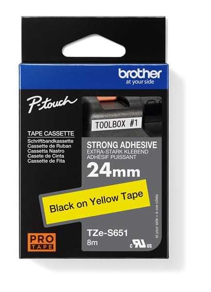 BROTHER TZES651 - kazeta TZ šířky 24mm, extrémně adhesivní lamino TZE-S651, žlutá/černé písmoBROTHER kazeta s extrémně adhezní páskou, laminovaná TZE-S651.