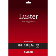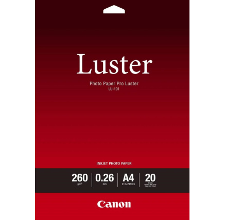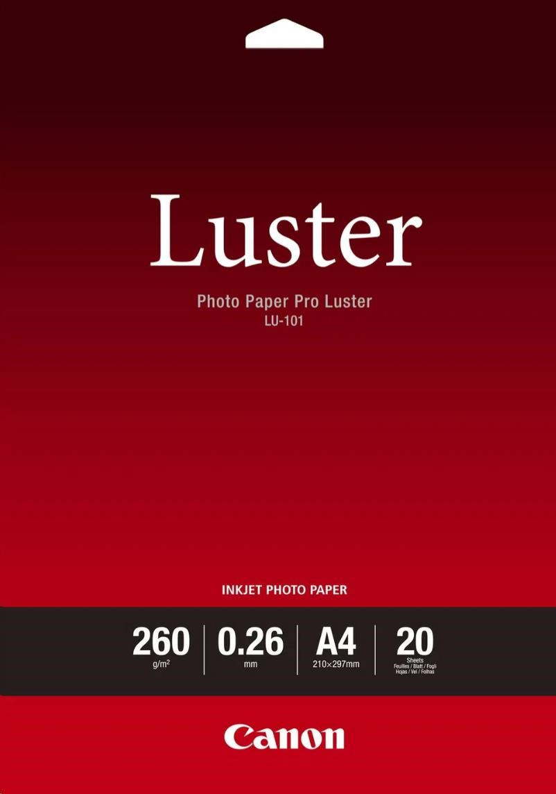 Canon fotopaír LU-101, A4, 20 ks, lesklý 260g/mTyp papíru:Fotografický; Maximální formát tisku/média:A4; Gramáž (g/m2):250-299; Tisková technologie:Inkoustová.