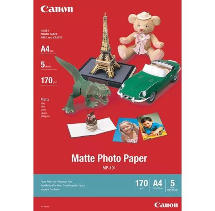 Canon fotopapír MP-101 A4, 50ks, matný, 170 g/mTyp papíru:Fotografický; Maximální formát tisku/média:A4; Gramáž (g/m2):160-199; Tisková technologie:Inkoustová.
