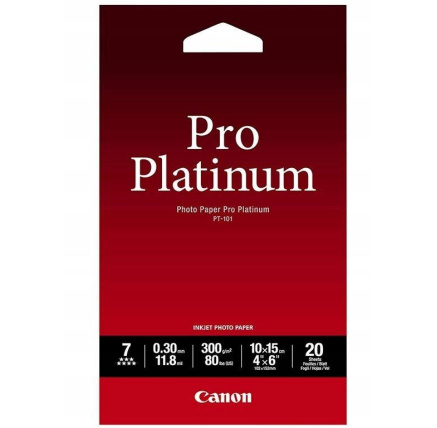 Canon fotopapír PT-101 10x15cm 20ks, lesklý, 300 g/mTyp papíru:Fotografický; Maximální formát tisku/média:10 x 15 cm; Gramáž (g/m2):300 a více; Tisková technologie:Inkoustová.