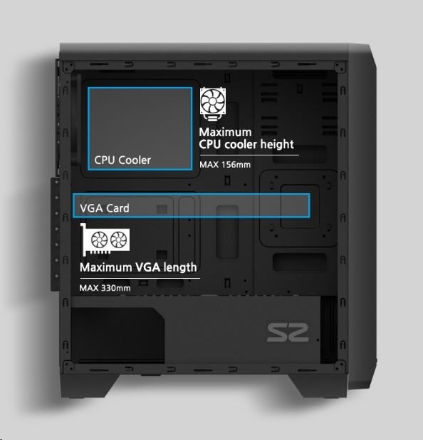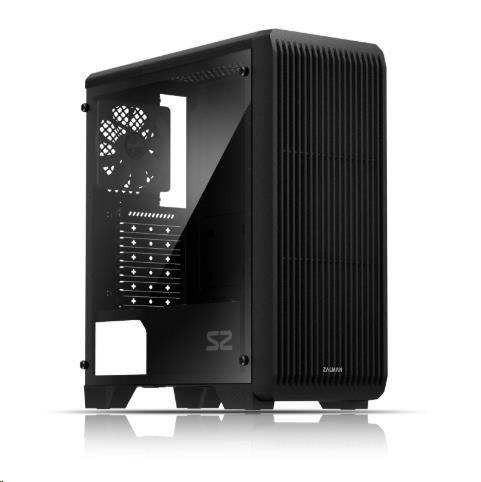 case Zalman miditower S2, ATX/mATX/Mini-ITX, bez zdroje, USB3.0, černáProvedení skříně:Midi Tower; Barva skříně:Černá; Počet pozic 3.5" (HDD):2; Počet pozic 2.5" (SSD):2; Vybavení PC skříně:Bez integrovaného zdroje, Přední Audio panel, Přední USB panel, Průhledná bočnice.