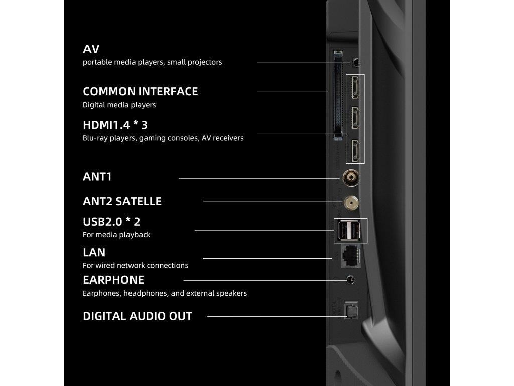 | Vstupy a výstupy: | AV vstup mini, CI+, digitální audio výstup, HDMI 2.1, USB 2.0, LAN, antény RF a LNB |