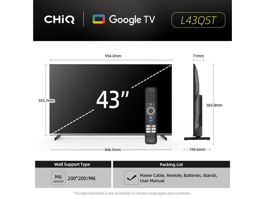 CHiQ 43“ L43QST, ultratenká bezrámečková QLED Smart Android 14 TV s HDR10, HLG, obrazovkou s Full HD s rozlišením 1920 x 1080 pixelů, prostorovým zvukem Dolby Audio a dbx-tv.