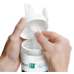 Před prvním použitím sundejte vrchní kryt, propíchněte fólii uprostřed pouze tak, abyste ze středu návinu vytáhli první ubrousky a protáhli je víkem dózy, které zpátky nasadíte.