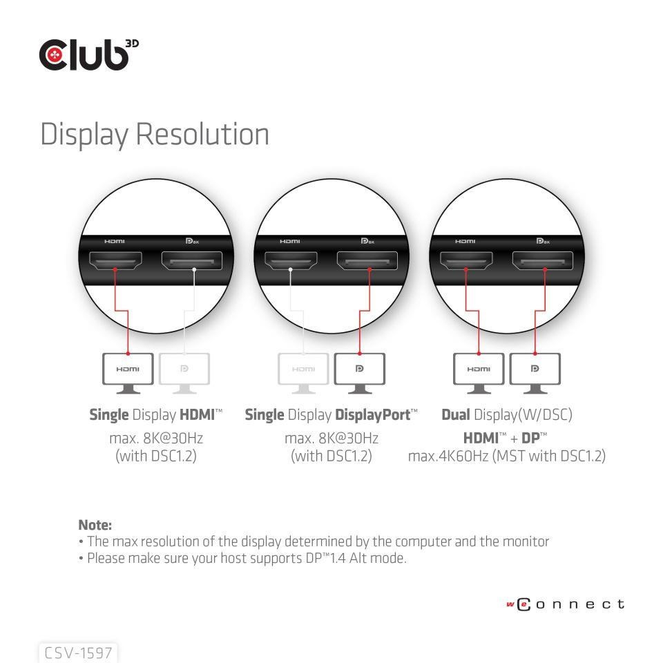 The Club 3D CSV-1597 USB Gen 1 Type-C 8-in-1 MST Dual 4K60Hz Display Travel Dock with HDMI™ 8K30Hz(HDR), DisplayPort™ 8K30Hz, 2x USB Gen 1 Type-A, BC1.2, RJ45, SD/Micro SD card slots and USB Gen 1 Type-C PD3.0 Female port, provides a very advanced, efficient solution to extend a single USB Gen 1 Type-C port to be multiple ports. It integrates video, data and power ports that allows to connect 2 displays simultaneously for enjoying videos on a larger screen, connect multiple USB Gen 1 devices for data transmission up to 5Gbps, connect a Gigabit Ethernet source for getting your PC connected to super high speed network, or connect to headset to enjoy fantastic music. It also provides PD charging for support up to max. 100W PD charging. This is for operating this device and charge the host simultaneously. It can work on all DP™1.4 Alt mode supported USB Gen 1 Type-C hosts.