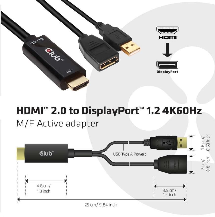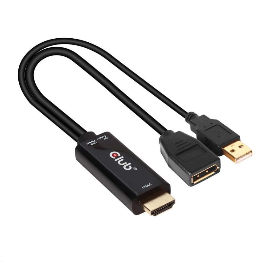 Club3D adaptér aktivní HDMI na DisplayPort 4K60Hz, M/FSpecifikace kabelu / redukce:Adaptér, Redukce; Input:USB, HDMI; Output:DisplayPort.