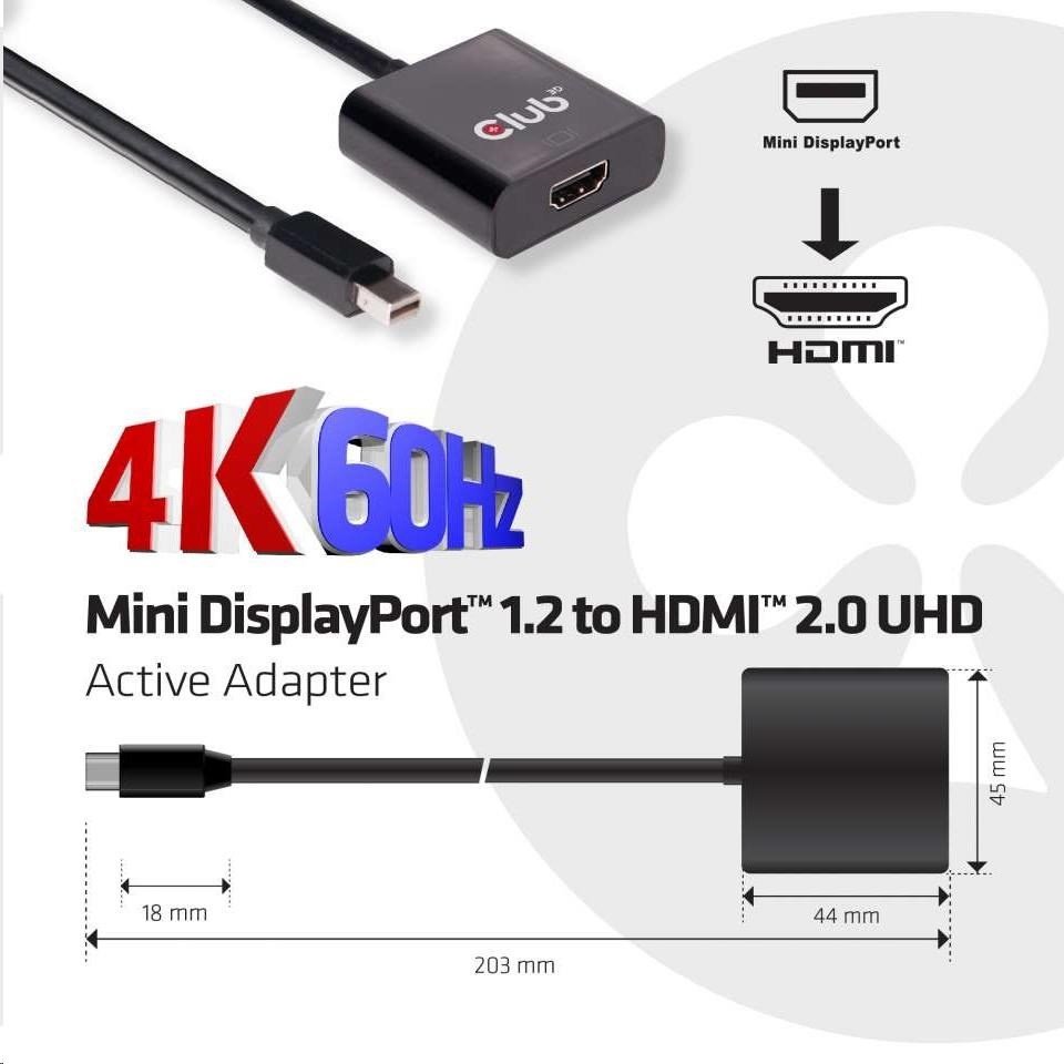 Club3D Adaptér aktivní mini DisplayPort 1.2 na HDMI 2.0 4K60Hz UHD, (M/F), 20cmSpecifikace kabelu / redukce:Adaptér, Redukce.